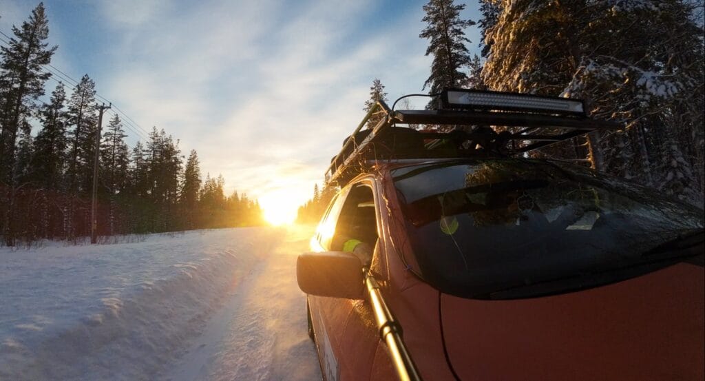 Rijden, rijden, bochtje hier, bochtje daar we vlogen door de boerderij weggetjes van Finland heen, opspuitende sneeuw voor je.